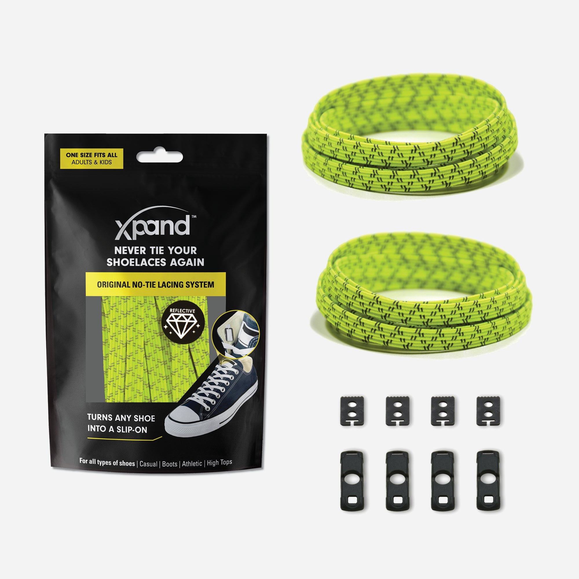 Xpand Lacing System works on all types of shoes - from kids shoes, adults sneakers, Timberlands to high-top boots.